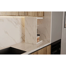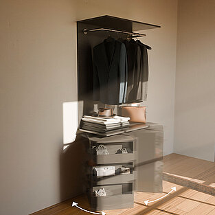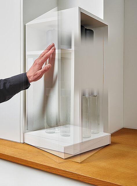 EasySpin is an innovative rotating mechanism that pulls furniture out from corners and makes it usable on both sides. A floor-mounted control cam and roller-guided movement allow the furniture to open and close gently and in a space-saving manner – without the need for traditional doors or drawers.