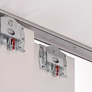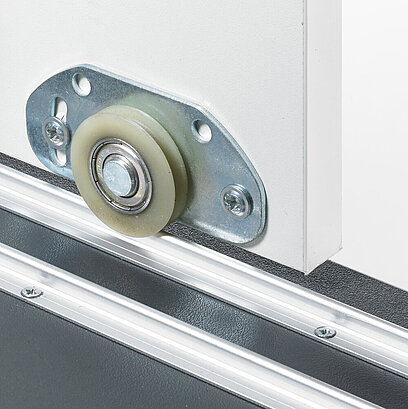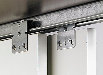Les portes coulissantes à guidage par le bas sont posées sur des galets avec leur bord inférieur et stabilisées au niveau du bord supérieur par un guide. Grâce à une construction de corps de meuble simple, aux faibles poids des portes et au montage facile, les portes à guidage par le bas constituent une introduction optimale dans la construction d’armoires à portes coulissantes.